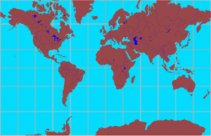 The Gall-Peters projection was developed to correct some of the distortion found in the Mercator system (Figure 2a-4). The Mercator projection causes area to be gradually distorted from the equator to the poles. This distortion makes middle and high latitude countries to be bigger than they are in reality. The Gall-Peters projection corrects this distortion making the area occupied by the world’s nations more comparable.